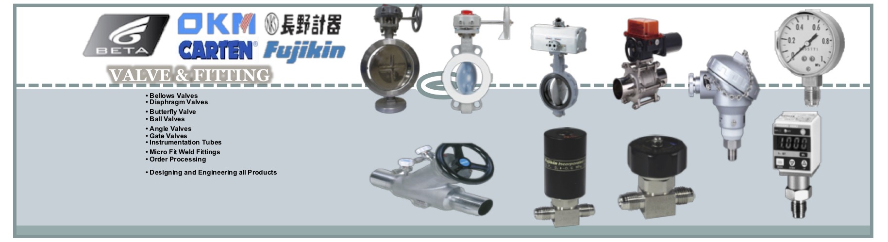 高純不銹鋼EP、BA/MP、AP等級管子/管道/管件;高純不銹鋼隔膜閥、波紋管閥、蝶閥、球閥、針閥、調(diào)壓閥等等;超純VCR、焊接、卡套接頭;以及設(shè)備應(yīng)用材料:壓力傳感器、壓力表、鋼瓶電子稱、火焰探測器、氣體探測器、鋼瓶緊急切斷裝置、加熱毯、加熱線、PTFE保溫纏繞帶;化學(xué)品供應(yīng)系統(tǒng)中的PFA閥門以及括口和焊接接頭,不銹鋼內(nèi)襯PFA/PTFE管道、閥門、接頭等配件。